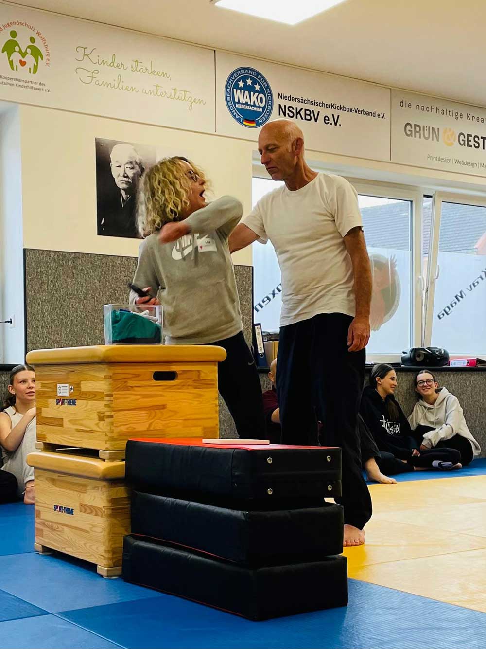 Mit seiner langjährigen Erfahrung und seinem vielseitigen Hintergrund hat er Teilnehmerinnen und Teilnehmer aus den Sparten Ju-Jutsu, Judo, und Kickboxen zusammenbracht. Begleitet wird Frank von Finnja Goltz, unsere erfahrene Kampfsportlerin vom Kickboxen und vom Kontaktkampf Krav Maga. Der Lehrgang bietet eine ausgewogene Mischung aus traditionellen Selbstverteidigungstechniken und modernen, praxisorientierten Kampfsituationen.