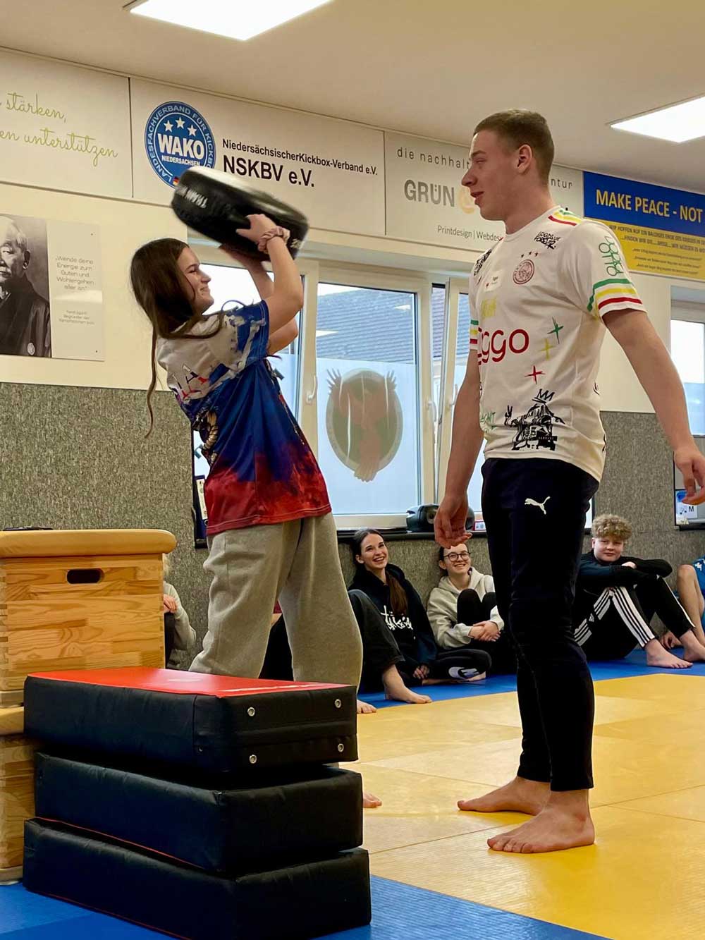 Darüber hinaus geht es in dem Kurs auch um den Umgang mit Konfliktsituationen im Alltag, z.B. in der Schule oder im öffentlichen Raum. Die Teilnehmenden gehen nicht nur mit neuen Techniken, sondern auch mit gesteigertem Selbstvertrauen und einem guten Gefühl im Umgang mit möglichen Konfliktsituationen nach Hause.